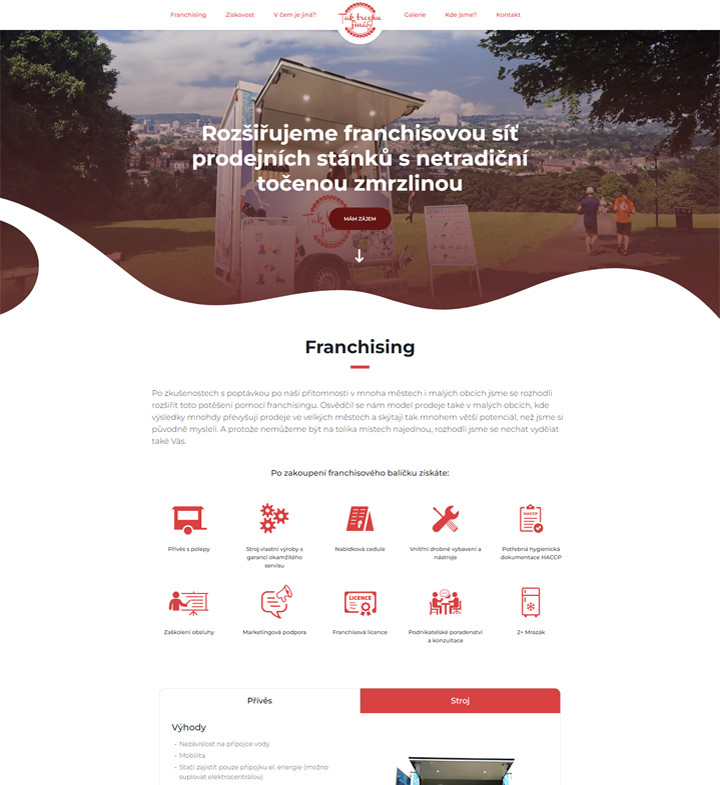Netradiční a unikátní český franšízový koncept oblíbený mezi zákazníky. Pojízdné stánky a INSTORE franšíza „Tak trochu jiná točená“ s netradiční točenou zmrzlinou z pravého ovoce. Klientovi jsme vytvořili přehledný jednostránkový prezentační web s fotogalerií a formuláři.